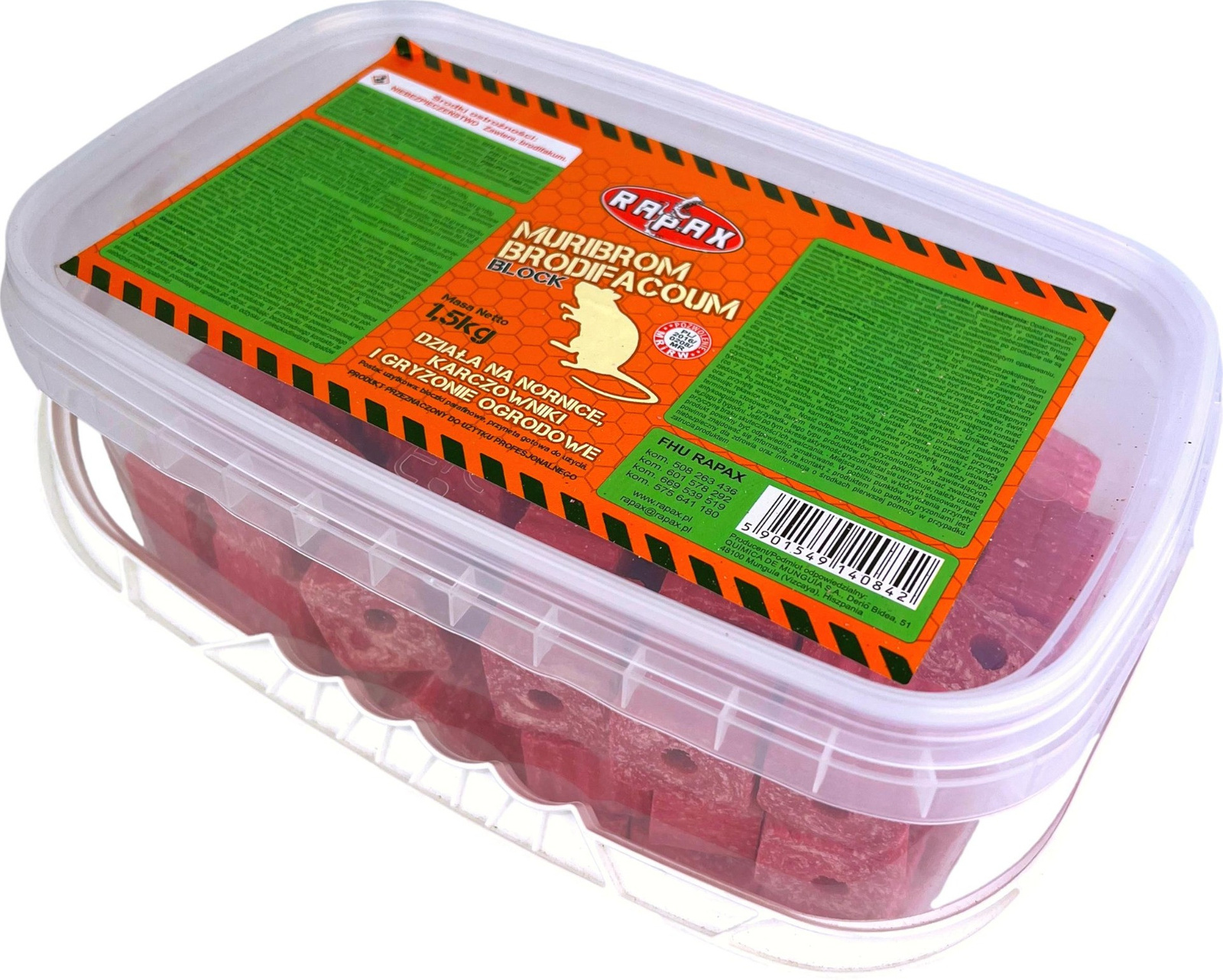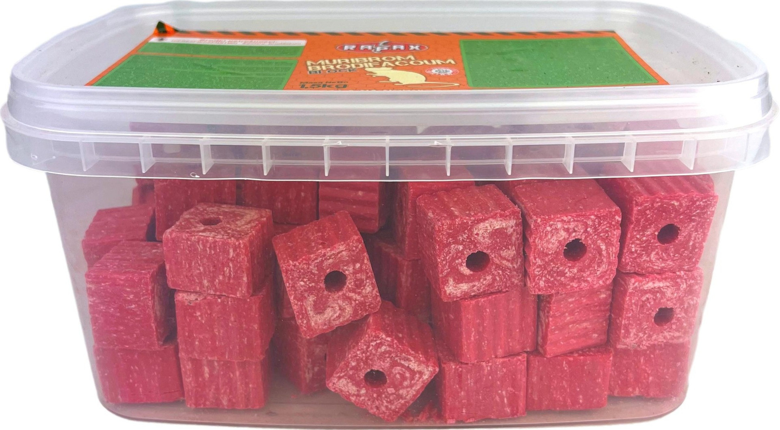 Kostka Muribrom Brodifacoum 1,5kg Rapax to przynęta gotowa do użycia, która skutecznie eliminuje nornice, karczowniki oraz inne gryzonie ogrodowe. Produkt przeznaczony jest do użytku profesjonalnego i występuje w formie bloczków parafinowych.