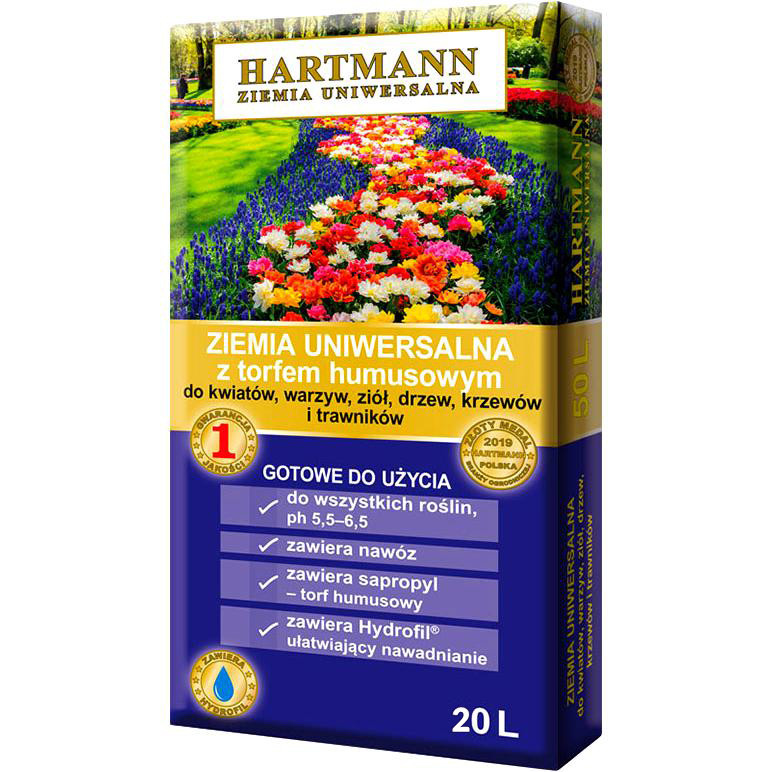 Ziemia uniwersalna marki Hartmann to gotowy substrat dosadzenia roślin w różnych miejscach, takich jak grunt, doniczki, skrzynki balkonowe oraz inne pojemniki. Produkt zawiera torf humusowy oraz Hydrofil, co sprawia, że ziemia jest czarna, ciężka i dobrze chłonie wodę. Specjalnie dobrany zestaw składników gwarantuje doskonałe warunki wzrostu dla większości roślin.