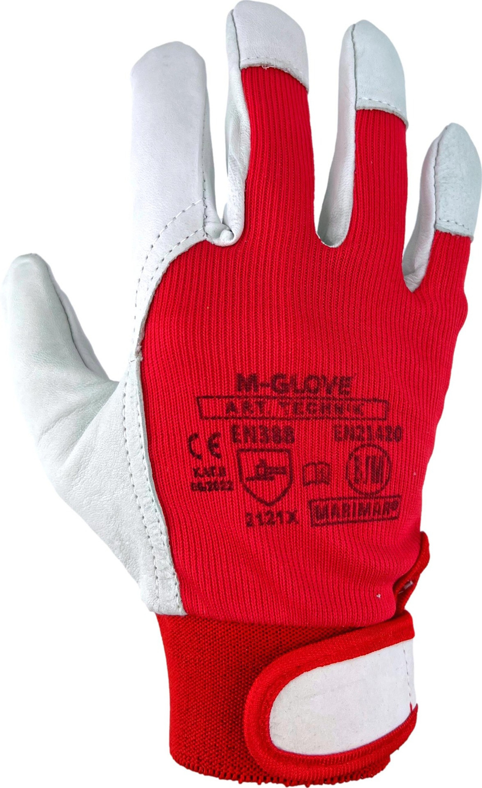 - Ochranné rukavice z pružného úpletu vyztuženého kozí kůží, celoprsté, se zapínáním na suchý zip na zápěstí. Ideální pro montážní práce vyžadující přesnost.