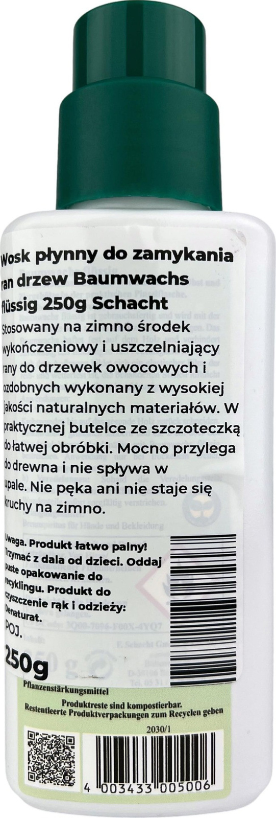 Tekutý vosk na utěsňování ran na stromech Baumwachs flüssig 250g Schacht je spolehlivým prostředkem k povrchové úpravě a utěsňování ran na ovocných a okrasných stromech. Je vyroben z vysoce kvalitních přírodních materiálů a poskytuje účinnou ochranu po celý rok.