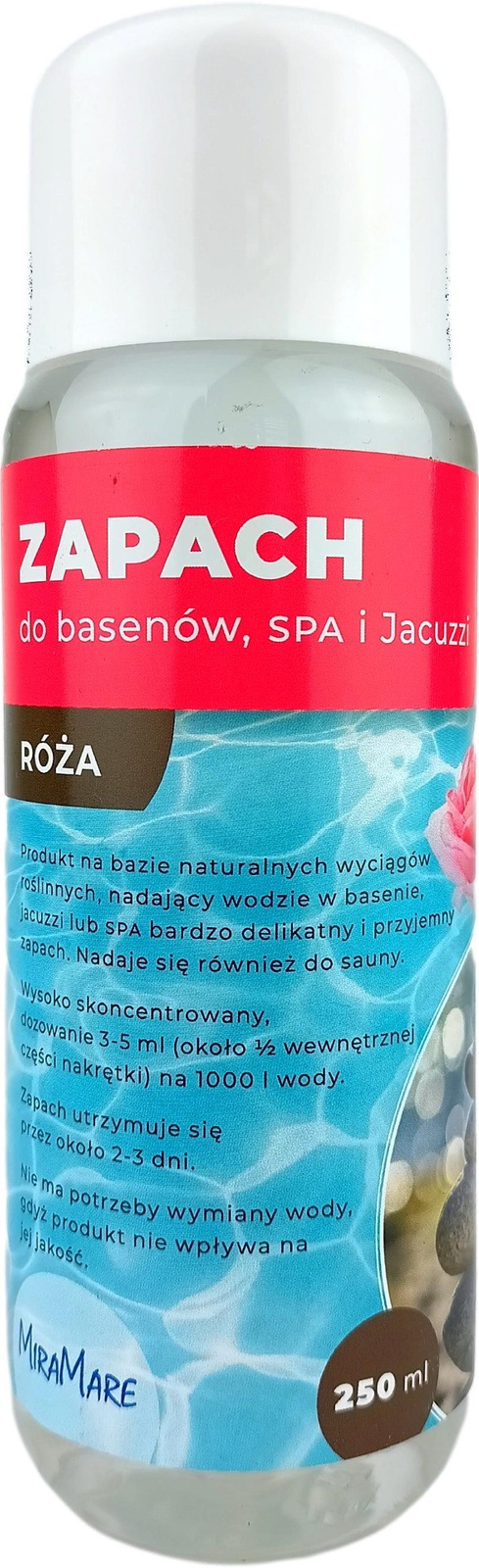 Zapach RÓŻA basen spa jacuzzi 250ml MiraMare jest produktem na bazie naturalnych wyciągów roślinnych, szczególnie róży, który nadaje wodzie bardzo delikatny i przyjemny zapach. Idealnie nadaje się do użycia w basenie, jacuzzi lub SPA, a także w saunie.