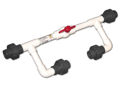 Zestaw przyłączeniowy do inżektora. Umożliwia zamontowanie inżektora na instalacji nawadniającej. Wyposażony w dwa gwinty zewnętrzne 1/2" oraz w dwa wyjścia z gwintami wewnętrznymi 1/2".