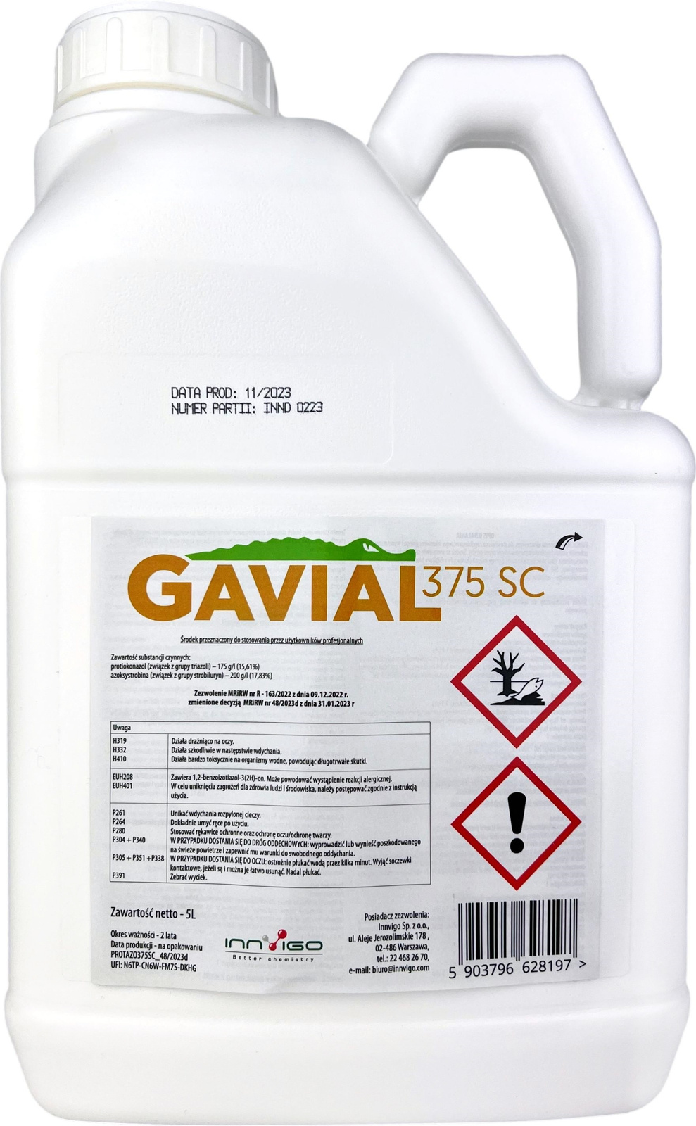 Gavial 375 SC 5L Innvigo to niezawodny FUNGICYD o działaniu układowym, który zapewnia szeroką ochronę przed chorobami powodowanymi przez grzyby. Dzięki unikalnemu połączeniu dwóch substancji czynnych, protiokonazolu i azoksystrobiny, Gavial 375 SC oferuje skuteczność oraz wszechstronność w zarządzaniu zdrowiem roślin. Wybierz Gavial 375 SC, aby cieszyć się zdrowszymi roślinami i wyższymi plonami.