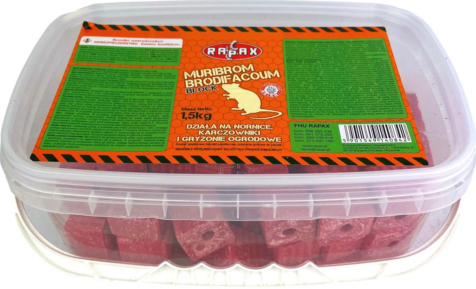 Kostka Muribrom Brodifacoum 1,5kg Rapax to przynęta gotowa do użycia, która skutecznie eliminuje nornice, karczowniki oraz inne gryzonie ogrodowe. Produkt przeznaczony jest do użytku profesjonalnego i występuje w formie bloczków parafinowych.