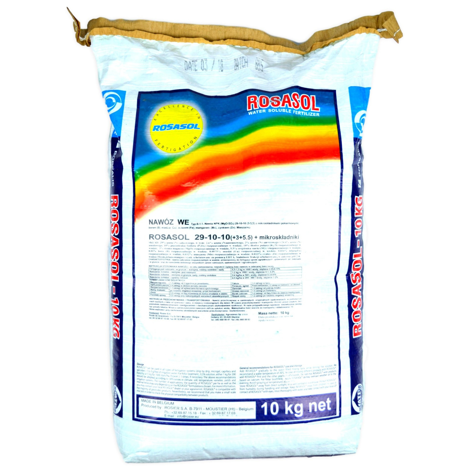 - Rosasol 29-10-10(3+5)+mikroskładnikijest nawozem całkowicie rozpuszczalnym w wodzie. Dostarcza roślinom cennych składników pokarmowych. Odnajduje swoje zastosowanie w uprawach sadowniczych, warzywniczych oraz rolniczych.