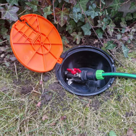 Studzienka poboru wody z zaworem 3/4 cala PEŁNA posiada pokrywę z dodatkową klapką. Pełna pokrywa studzienki zabezpiecza jej wnętrze przed ślimakami, stanowi dodatkową ochronę zaworu przed niską temperaturą oraz pełni funkcję dodatkowej ozdoby każdego ogrodu.