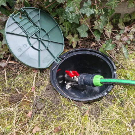 Studzienka poboru wody z zaworem 3/4 cala PEŁNA posiada pokrywę z dodatkową klapką. Pełna pokrywa studzienki zabezpiecza jej wnętrze przed ślimakami, stanowi dodatkową ochronę zaworu przed niską temperaturą oraz pełni funkcję dodatkowej ozdoby każdego ogrodu.