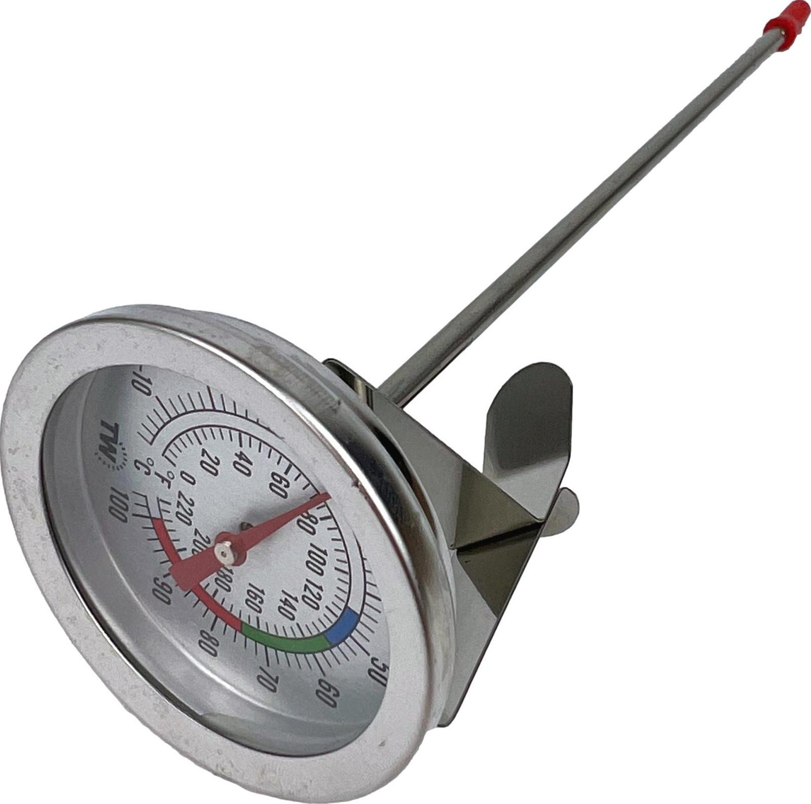 Oferujemy wysokiej jakości termometr do topienia wosku z sondą ze stali nierdzewnej 300 mm i wygodnym klipsem do mocowania z boku naczynia. Dzięki regulowanemu klipsowi, termometr można podnieść lub obniżyć w zależności od głębokości naczynia, co zapewnia precyzyjne monitorowanie temperatury. Idealny do wosku, parafiny oraz Rebwachsu.