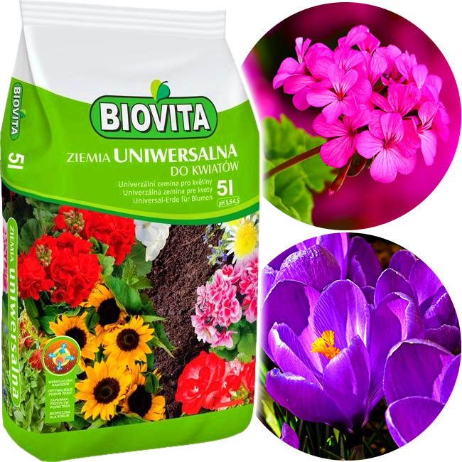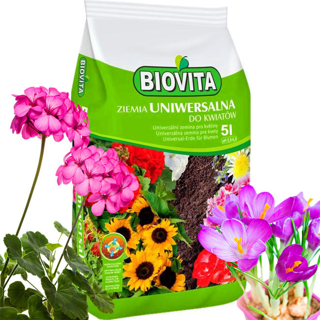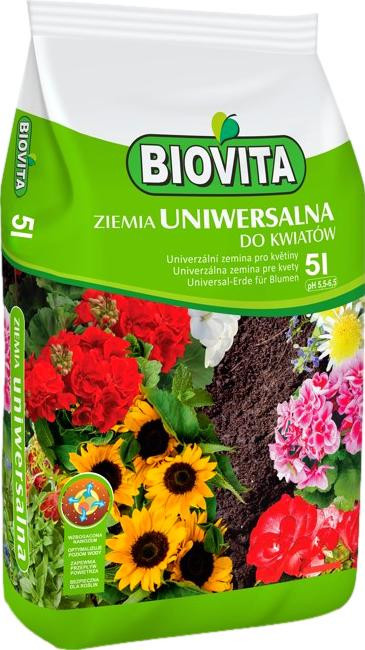 Ziemia uniwersalna BIOVITA jest niezastąpionym podłożem do sadzenia oraz przesadzenia roślin ozdobnych w domach, ogrodach, na balkonach i tarasach, z wyjątkiem roślin kwasolubnych. Zawiera nawóz wieloskładnikowy, dzięki czemu nie wymaga nawożenia przez okres 4 do 6 tygodni. Zawarty w podłożu torf wysoki zwiększa pojemność powietrzną, poprawia strukturę, stwarza korzystne warunki do rozwoju systemu korzeniowego. Odpowiednio skomponowana mieszanka składników zapewnia bardzo dobrą pojemność wodną, nie należy jednak dopuszczać do całkowitego wysychania podłoża. Starannie dobrany skład chemiczny i fizyczny ziemi stwarza roślinom dogodne warunki rozwoju i wegetacji.
