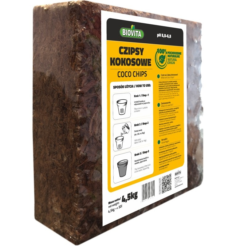 - COCO chips Czipsy kokosowe brykiet (pH 5,5-6,5) to naturalny produkt powstały w wyniku rozdrobnienia łupin i włókien kokosowych, sprasowanych w formę brykietu.