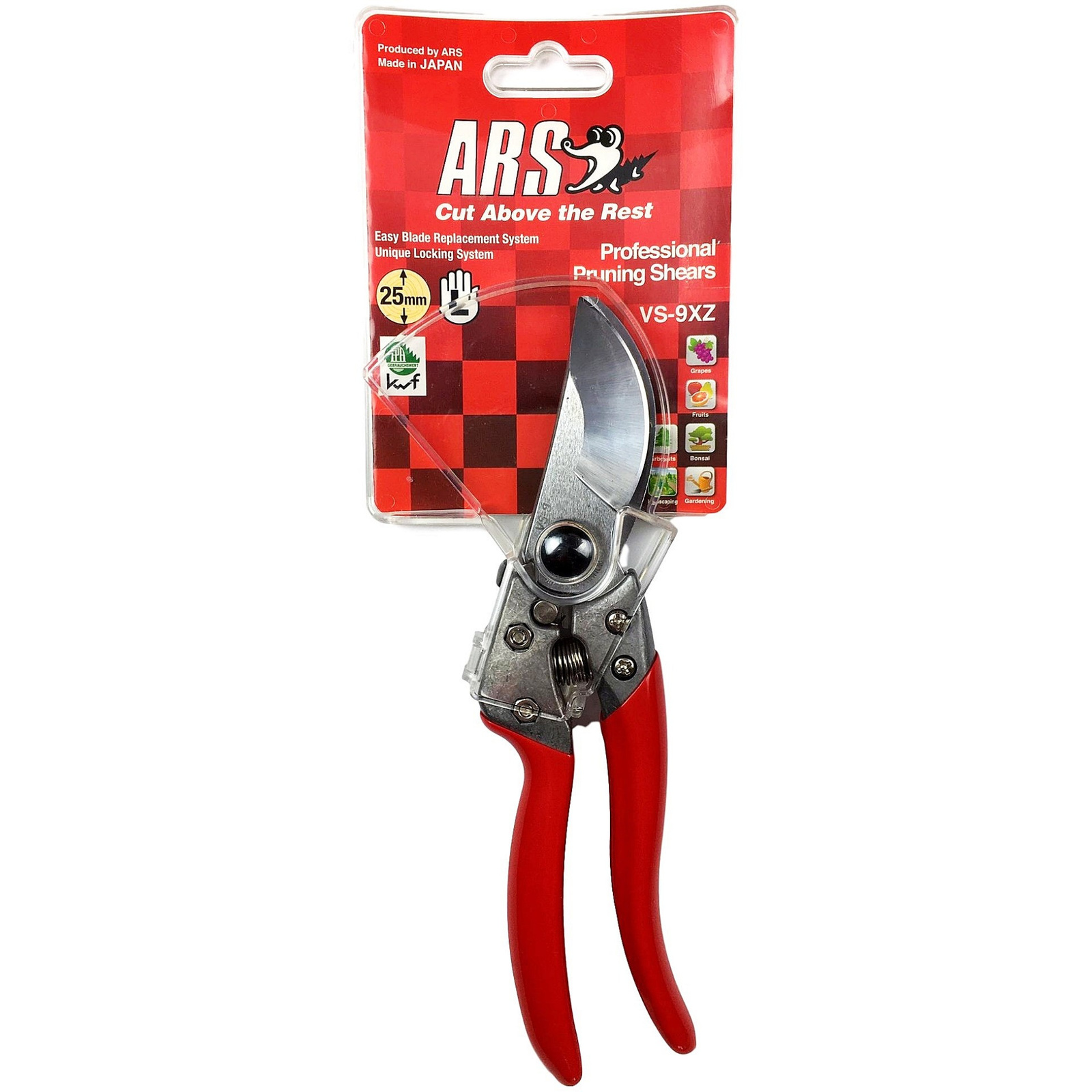 - Foarfecă de tăiat cu o singură mână ARS VS-9XZ pentru tăierea ramurilor cu diametrul de până la 25 mm. Acest foarfece de grădină fiabil, robust și puternic a fost proiectat și fabricat de compania japonezăARS, având în vedere condițiile de lucru solicitan
