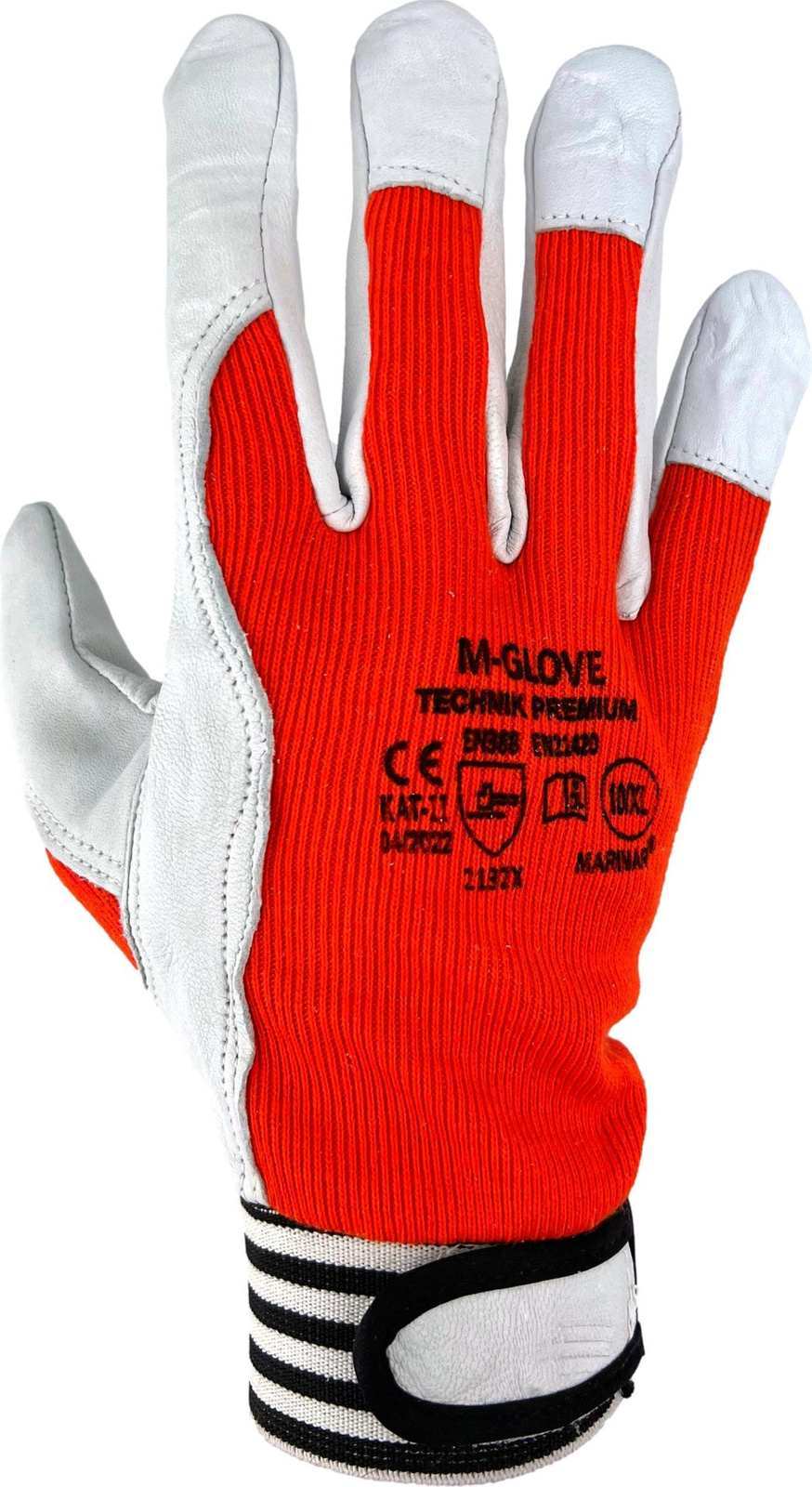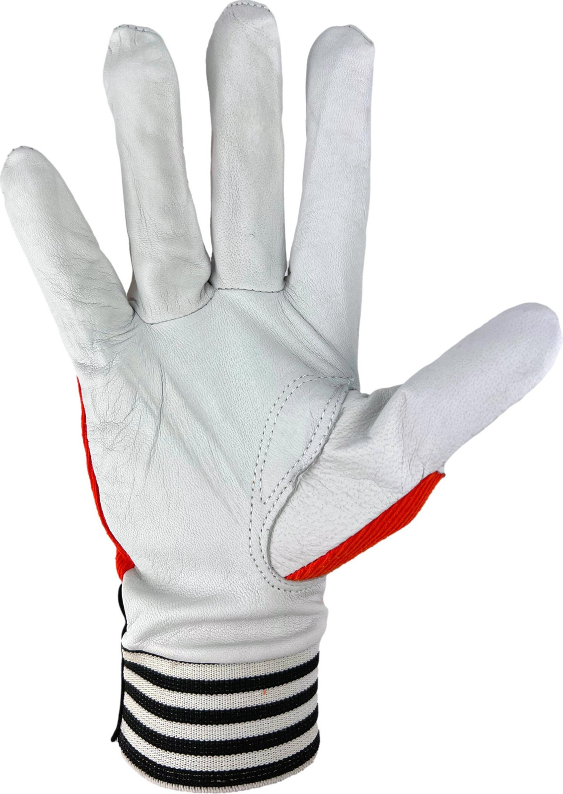 Mănuși de protecție confecționate din din țesătură elastică tricotată, întărită cu piele de capră, full-face. Velcro la încheietura mâinii. Are vârfurile degetelor și degetul arătător ranforsate cu piele.