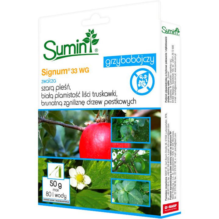 Signum 33 WG 50g Sumin este un fungicid eficient sub formă granulară pentru prepararea unei suspensii apoase. Produsul are un efect sistemic pentru controlul și prevenirea eficientă a bolilor fungice. Ideal atât pentru utilizare preventivă, cât și pentru intervenție.