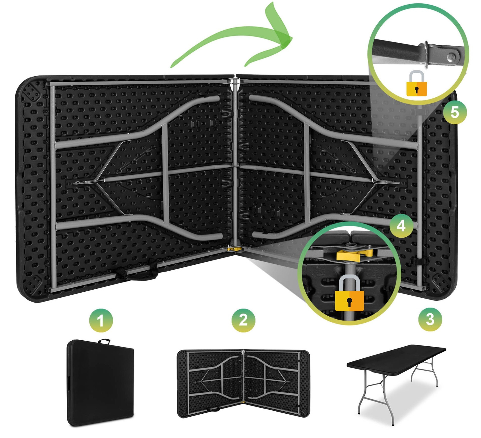 2. Otwórz "walizkę", rozszerz stół w poziomie i ustaw nogi.