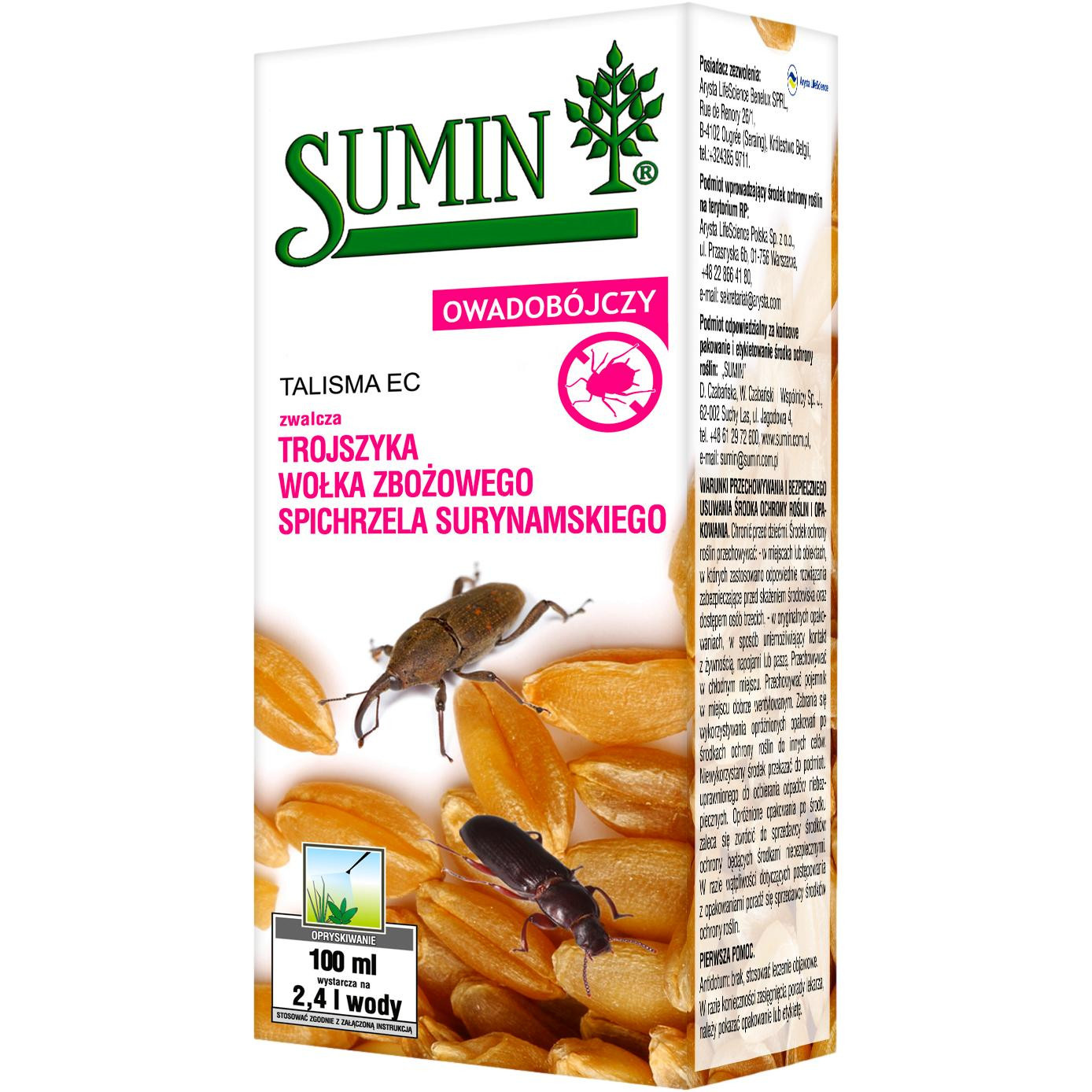 Talisma EC 100ml Sumin to wysoce skuteczny środek owadobójczy w formie koncentratu do sporządzenia emulsji wodnej. Jest przeznaczony do zwalczania szkodników magazynowych ziarna zbóż takich jak: wołek zbożowy, kapturnik zbożowiec, trojszyki, spichrzel surynamski.